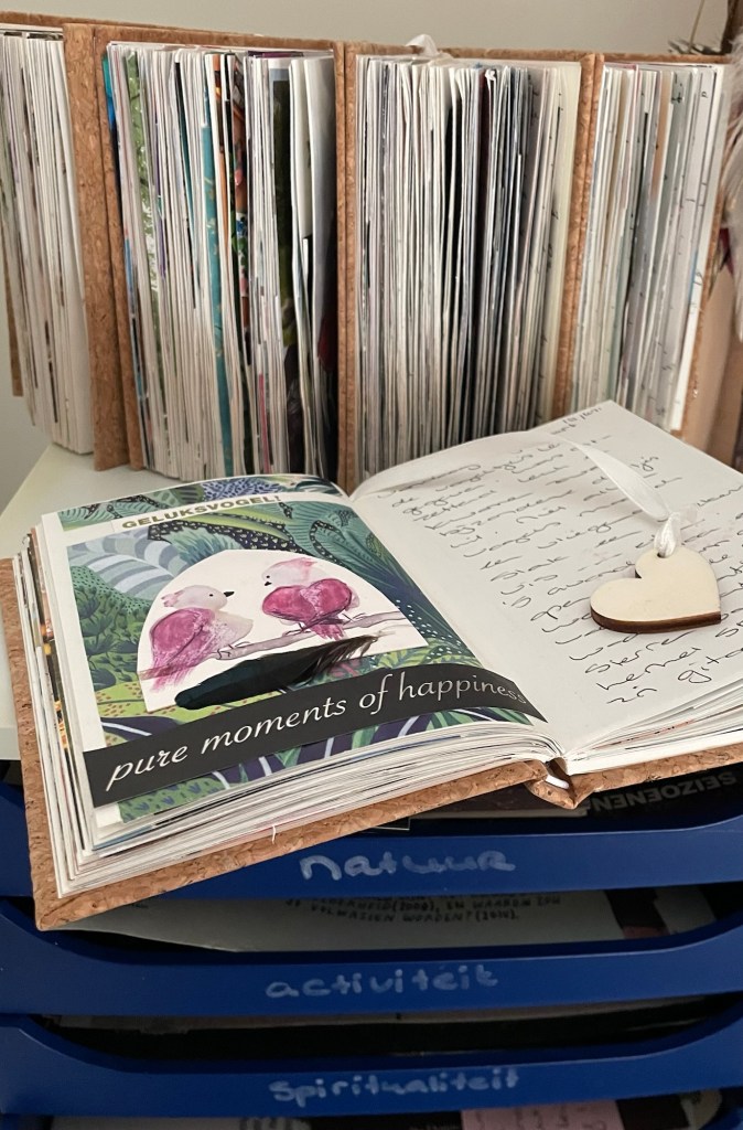 Ik heb inmiddels archief-ladekastjes vol met in elke lade thema-gerelateerde afbeeldingen zoals natuur, spiritualiteit, mensen, dieren, seizoenen, inspirerende teksten. Deze scheur ik uit tijdschriften als Flow, Happinez, psychologie Magazine en natuurtijdschriften (tip; die kun je bij kringloopwinkels halen voor weinig).