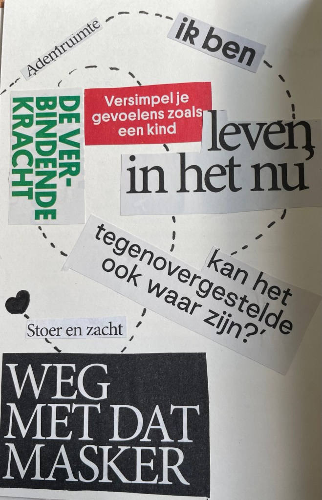 Tegenwoordig zijn de beeldende dagboekbladzijden niet alleen meer een weergave van de belevingen van mijn dag. Inmiddels plak ik heel intuïtief afbeeldingen en teksten bij elkaar en zie ik pas later de diepere ‘meaning’ ervan. Zo heeft de creatie me regelmatig iets nieuws te vertellen.