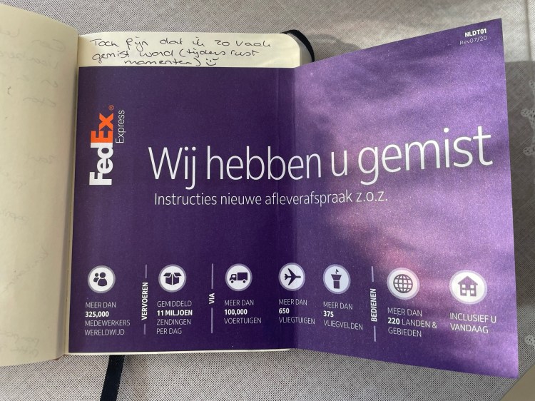 Ik weet nog dat ik even heel diep zat tijdens Long Covid en ik na mijn zoveelste rustperiode van de dag een kaartje op de mat vond van de postbezorger. Hierop stond ‘Helaas we hebben je gemist’. Ik moest daar een beetje (zuur) om glimlachen omdat ik die tekst best grappig vond in tijden dat ik maatschappelijk totaal geen bijdrage kon leveren. Dus ook dat kaartje kwam natuurlijk in mijn boekje terecht;-)