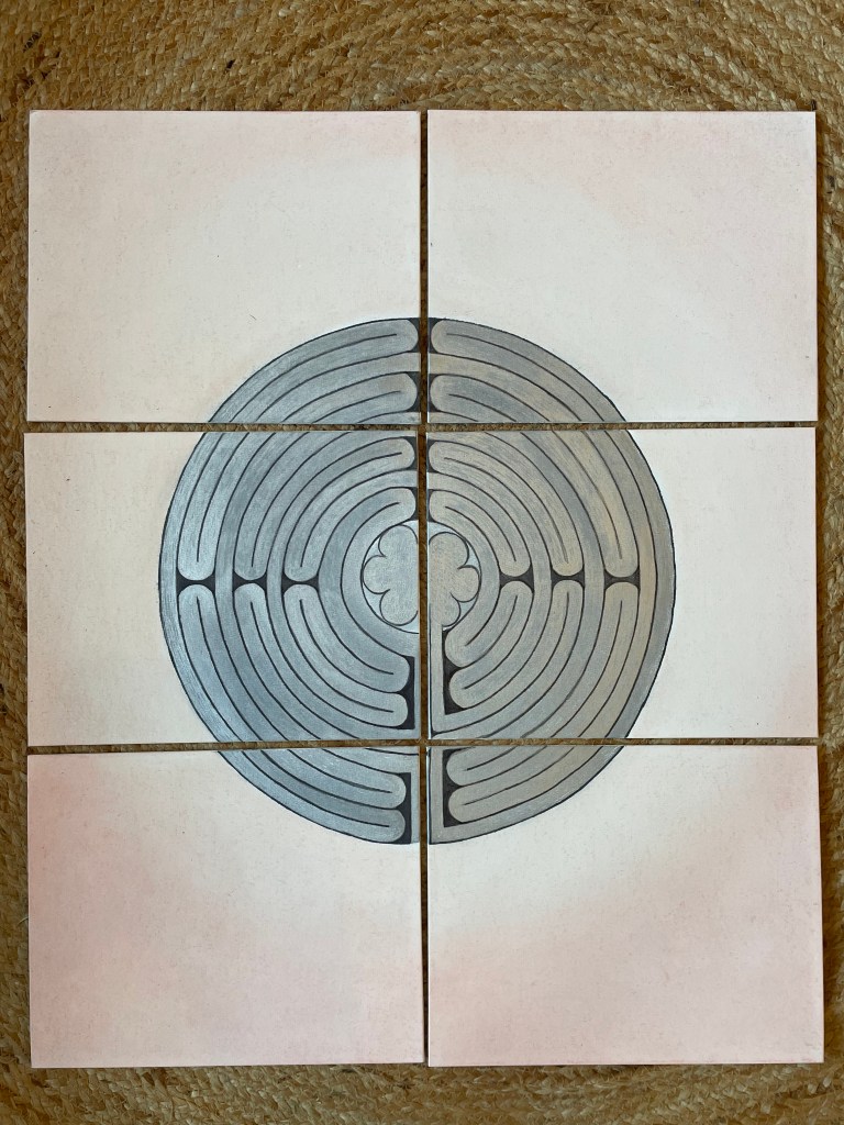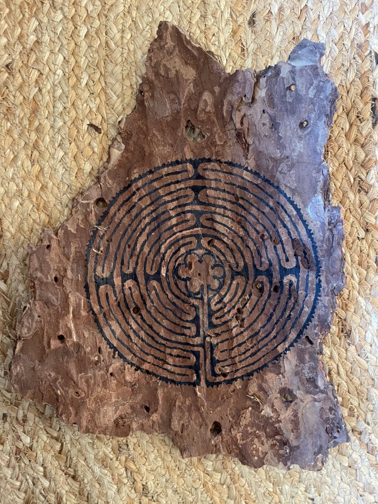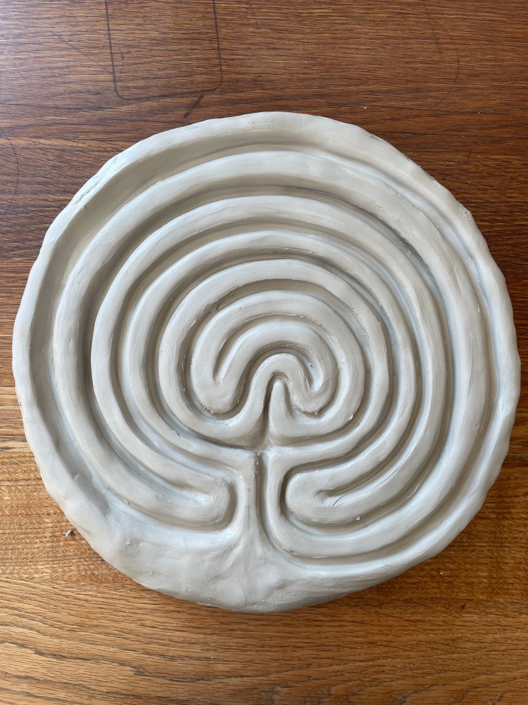 En ja, ik zou ik niet zijn als ik daar deze week ook niet creatief mee aan de slag was gegaan. Ik heb het labyrint geschilderd, waarbij in de vorm heb verdeeld over 6 kleine schildersdoeken. Dat was nog een behoorlijk gegum en gepuzzel moet ik zeggen. Maar zo leuk om uit te vogelen en zo gaaf toen ik ‘m eindelijk kloppend en stromend had gekregen. Thuis gekomen heb ik een eenvoudiger labyrint in klei gemaakt. Gaaf om het echt ruimtelijk op te bouwen en met mijn vinger het pad te volgen. Een tijd geleden heb ik ook eens een labyrint gemaakt op een stuk boombast.